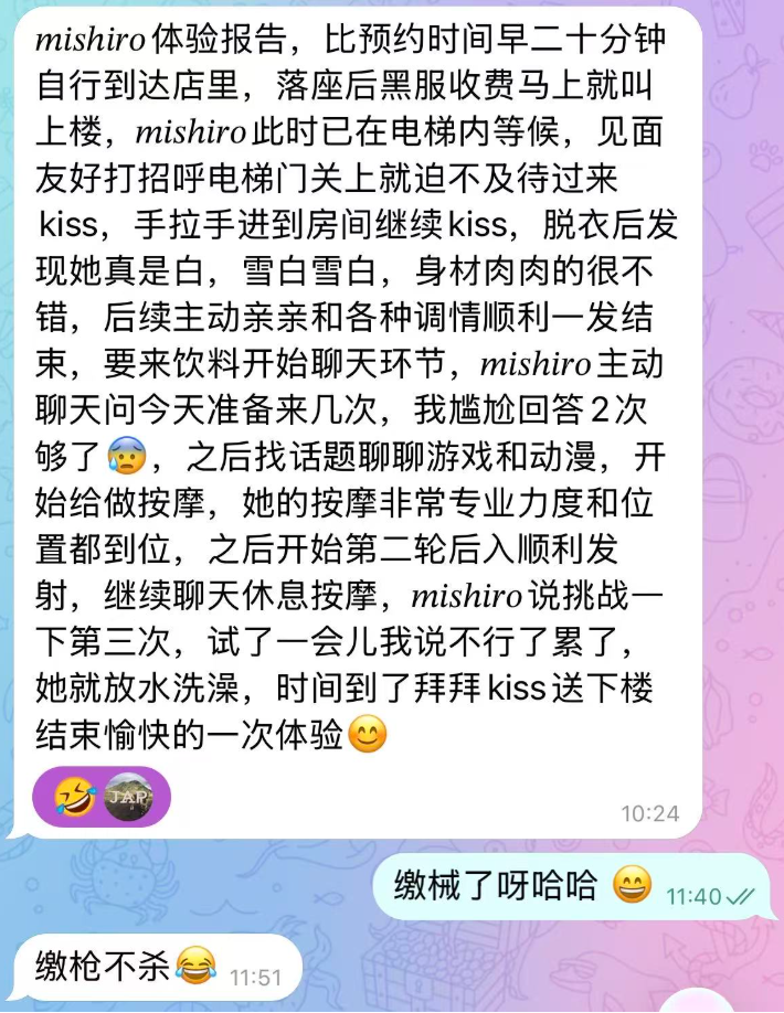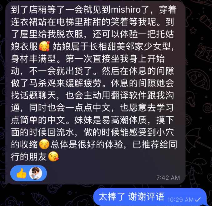 由於是早班店內沒其他客人,等了一下後Mishiro 本人在電梯內迎接,本人很可愛,臉蛋是可愛微肉型的,但我覺得有比照片更瘦一點,真人好看很多,挽著手很熱情,到房間後自我介紹一下,就開始親嘴脫衣服環節,發現原來mishiro 沒穿內衣,有被這大膽驚艷到,胸部大又軟,身材方面個人不覺得肉,算是很剛好,改有肉的地方都有肉,她也很講求效率即尺後就開始做了,不到一下就繳械,後面就點了飲料並且用翻譯軟體小聊天了一下,她算是會找話題的女生,基本上不會冷場,因為mishiro不做水床,但有提供按摩服務也是很不錯,後來按摩完時間很很多,就開始慢慢調情進行第二次,用了女上位+背後式完成第二次,因為前面沒用多少時間大概還剩快一小時,mishiro就有提議說要做三次,不過因為是早上又前面很快兩次,所以第三次搞了有點久,不得不說就要稱讚她敬業了,過程中沒有不耐煩,而且很努力的想完成第三次,口手並用了好久,後來搞到剩最後5分鐘趕快使用洗個澡,全程還是笑臉,非常值得推薦,最後走mishrio還幫忙我跟店內叫了計程車去趕下個行程,真的是非常貼心 ![【推荐泡泡姬 】[MISHIRO]来自吉原高級泡泡浴 ルピナスパルフェ 第3张](https://www.lelemap.com/wp-content/uploads/2026/03/eed1e75487264593b9b90f01aea958fe.png)